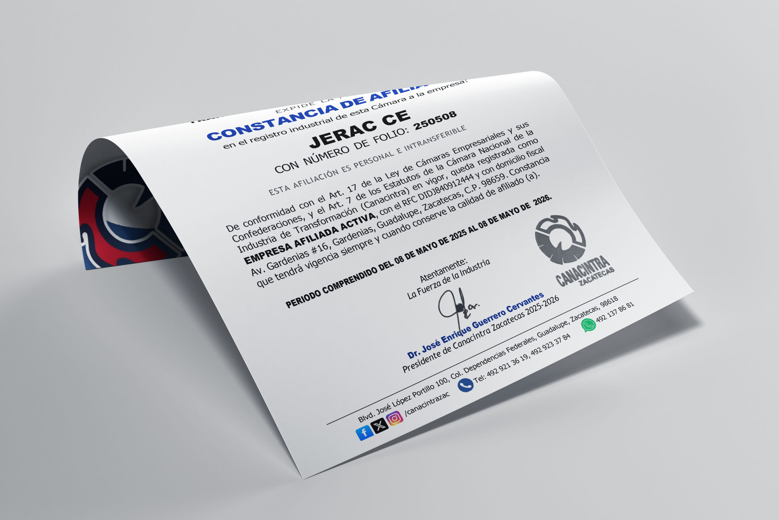 El reconocimiento fue expedido por el presidente de CANACINTRA Zacatecas 2025-2026, Dr. José Enrique Guerrero Cervantes, bajo el folio 250508, otorgando a Grupo JERAC® la constancia de afiliación que tendrá vigencia del 8 de mayo de 2025 al 8 de mayo de 2026.